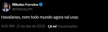 Apesar disso, parlamentares conservadores entenderam o conteúdo como um posicionamento ideológico. O ex-deputado federal Eduardo Bolsonaro publicou um vídeo descartando um par de sandálias da marca e afirmou que começaria o ano “com o pé direito, mas não de Havaianas”. Já o deputado Nikolas Ferreira escreveu que “Havaianas, nem todo mundo agora vai usar”, incentivando seguidores a deixarem de consumir os produtos. Além deles, outros políticos e influenciadores de direita também passaram a criticar a campanha e associá-la a um suposto viés político da empresa.