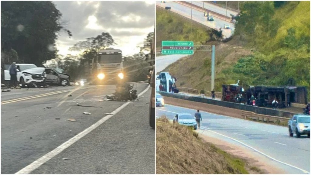 O primeiro acidente aconteceu por volta das 6h30, no km 367 da BR-381, entre os municípios de João Monlevade e São Gonçalo do Rio Abaixo, na localidade conhecida como Porteira Amarela, no sentido Belo Horizonte. De acordo com o Corpo de Bombeiros, quatro carros de passeio colidiram e cinco pessoas ficaram feridas. Nenhuma das vítimas ficou presa às ferragens ou teve ferimentos graves. Todas foram socorridas no local. A Polícia Rodoviária Federal (PRF) foi acionada para controlar o tráfego, que ficou lento nos dois sentidos da rodovia. Às 7h41, a pista seguia parcialmente interditada, exigindo atenção redobrada dos motoristas.