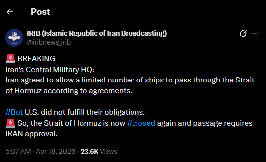 Segundo o Comando Militar Central Khatam Al-Anbiya, o Irã havia permitido, de forma temporária e controlada, a passagem de um número limitado de petroleiros e navios mercantes após negociações. No entanto, o país afirma que os Estados Unidos descumpriram compromissos firmados, o que levou à retomada do controle total da passagem marítima pelas forças armadas iranianas.