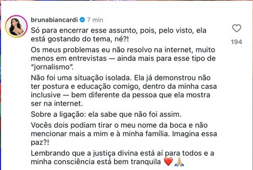Biancardi finalizou seu comentário destacando que deseja afastar sua família das polêmicas públicas: “Vocês dois podiam tirar o meu nome da boca e não mencionar mais a mim e à minha família. Imagina essa paz?! Lembrando que a justiça divina está aí para todos e a minha consciência está bem tranquila”, escreveu.