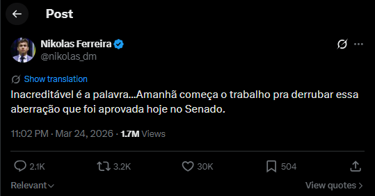 A declaração foi feita nas redes sociais, logo após a aprovação do projeto. Na publicação, Nikolas classificou a proposta como uma “aberração” e sinalizou que iniciaria articulações contra a medida. O projeto, identificado como PL nº 896/2023, inclui a misoginia entre os crimes de preconceito ou discriminação, ampliando o alcance da legislação já existente.