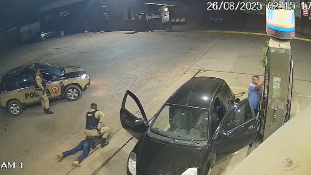 As imagens mostram o momento em que o veículo chega ao posto para abastecer. Ao notar a presença da viatura, a mulher fica apreensiva e chega a tirar o cinto de segurança. Enquanto o agressor se movimenta entre sair e retornar ao carro, ela aproveita a presença da PM, abre a porta e corre em direção aos militares. A ação rápida resultou na imobilização imediata do homem.